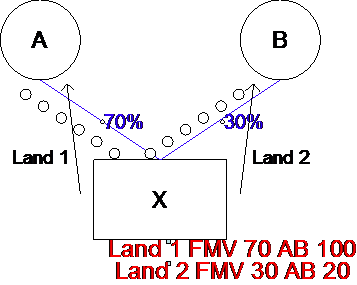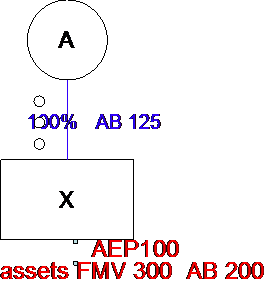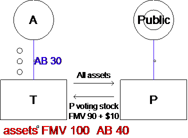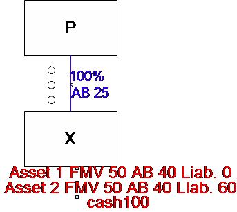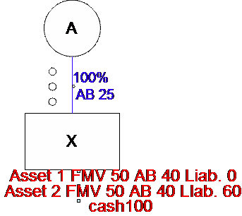Treatment:  While §336(a) would treat X as having a gain of 20 (FMV of 100 less AB of 80), the FMV for purposes of measuring X’s gain or loss on each asset is deemed to be not less than the liabilities on such asset.  Accordingly, X will have a gain of 10 on asset 1 (50 – 40) and 20 on asset 2 (60 – 40) because the liabilities of 60 on that asset exceed the assets FMV.  Apparently, this adjustment does not impact A’s amount realized (100 – 60 = 40) by increasing the value of asset 2 to 60, or A’s gain (40 – 25 = 15).