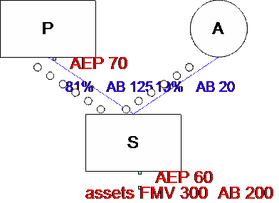Assumptions:  S distributes to P assets with a FMV of 243 and AB of 125.  S distributes to A assets with a FMV of 57 and AB of 50.