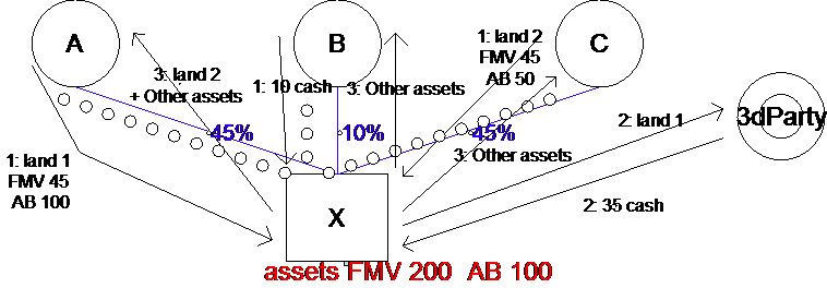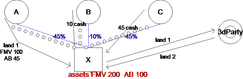 Treatment:  Because A, B and C are not related, they are also not considered related to X Corp. under §267.  Accordingly, §336(d)(1) does not apply.  §336(d)(2) does, however, apply to parcels 1 and 2,because these assets were acquired as part of a plan a principal purpose of which was to offset gains in the liquidation.  This is true for parcel 1 because the loss they hoped to generate would have been carried over to offset the liquidation gain as well as parcel 2 where the hoped-for loss would have been generated in the liquidation itself.  Because §336(d)(2) applies, the basis of each asset for purposes of determining loss is reduced by the loss built-in at the time of contribution.  For parcel 1, this loss basis would be 45 (actual basis of 50 less the built-in loss of 5).  Accordingly, X would recognize a loss of only 10 from parcel 1.  For parcel 2, the loss basis would also be 45 (actual basis of 100 less built-in loss of 55).  Because the asset has a value of 60 at the time of liquidation, which is in between its loss basis of 45 and its gain basis of 100, X recognizes neither gain or loss on the liquidating distribution of this asset.