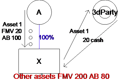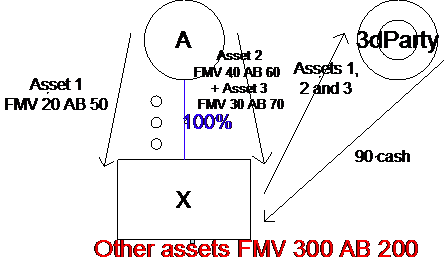Assumptions:  A’s contribution of asset 1 was more than 2 years prior to adoption of a plan (explicit or implicit) to liquidate X.  A’s contribution of assets 2 and 3 occurred 18 months prior to the adoption of the plan to liquidate.  Asset 2 has a clear and substantial relationship to X’s business.  Asset 3 does not.  The sale of these assets, at their unchanged FMVs, occurs 8 months prior to liquidation.